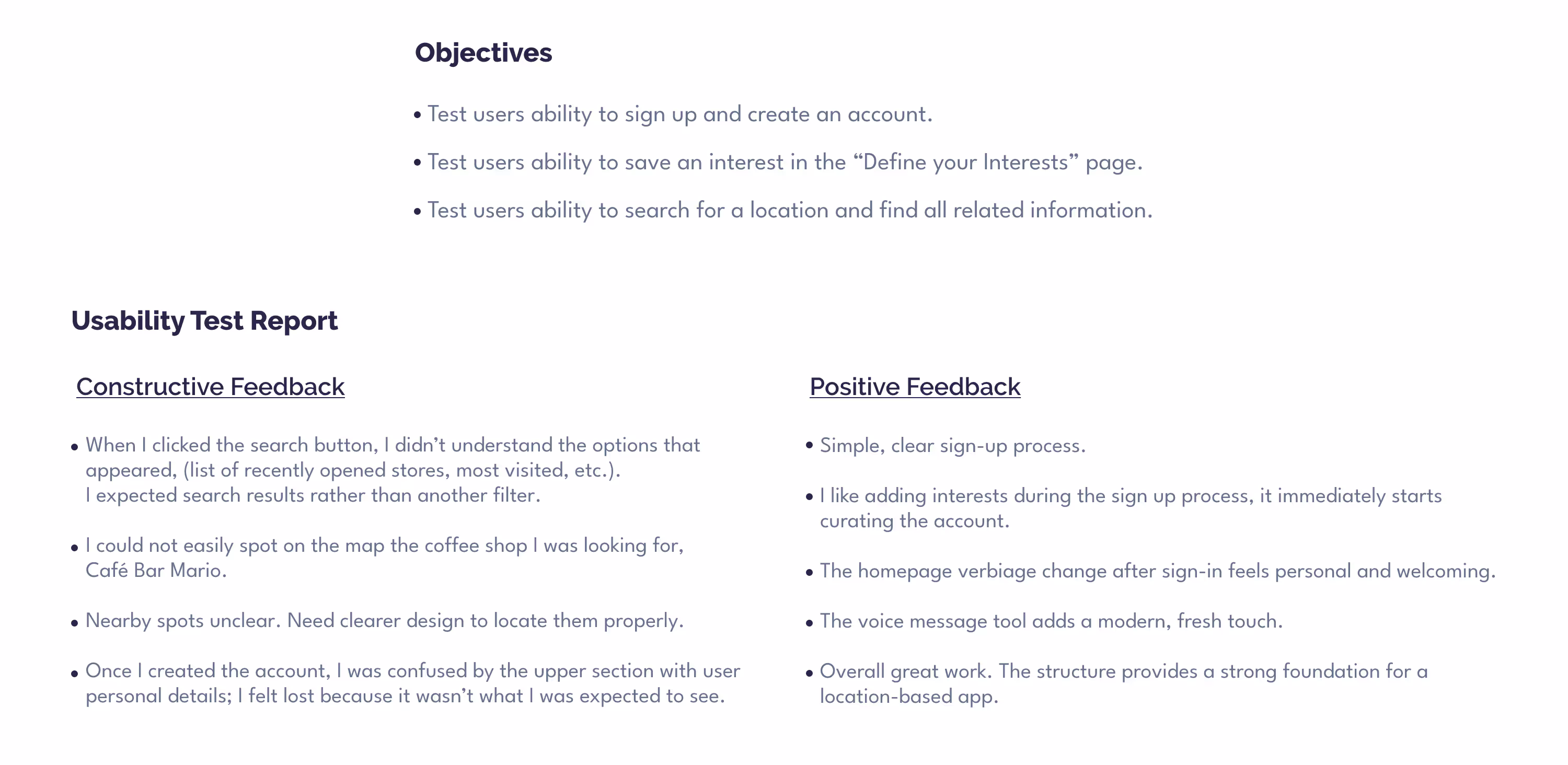 The goal was to evaluate mobile usability with three users, observing whether they could easily understand the information architecture, navigate, and complete specific tasks.
